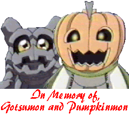 March 2, 2000 Ok, ok I know I need to update the page, but please just give it time. It'll be slowly updated, hey I got a life too! Alright I uploaded all the new pics, so I'm hoping it'll show up. I will be posting Nick Farmer's email up, so if you have any Digimon toy questions, you can email him. He also found many action figures, I will post the info soon. Cause I don't have the info with me now. Next order of business, Season One of Digimon will be ending soon. The last episode of Digimon will be called "End of Summer" So if you still want to watch Digimon, tell FOXKIDS to buy the next seasons! Or Digimon as we know it will soon be gone!
